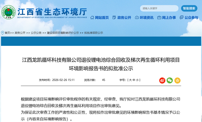 2月26日,江西省生态环境厅正式发布公示,对江西龙凯循环科技有限公司退役锂电池综合回收及梯次再生循环利用项目的环境影响报告书作出拟批准决定。