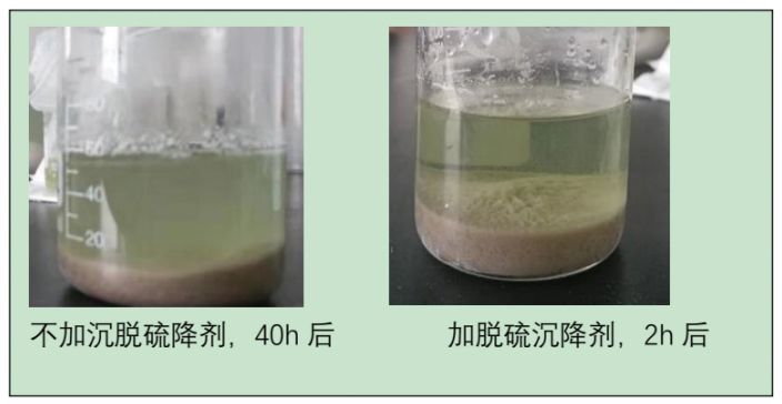 取 100ml 原料磷酸,加 5g 矿粉,搅拌,加热至 60°C,保温搅拌 2 小时,分别加入 0.25g 脱硫沉降剂和 0.5g 0.5% 非离子 PAM,继续搅拌 1 分钟,停止搅拌,将温度降至 50°C 左右,保温静置,大约 3 小时,微细颗粒物即可完全沉降,上清液非常澄清。使用沉降剂效果如下图所示。工业过程按上述比例放大即可。